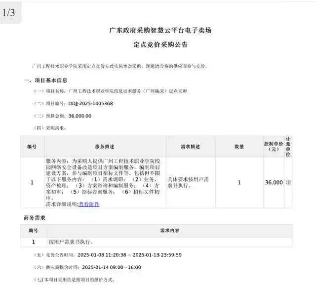 在該項目對應(yīng)的采購公告中,廣州工程技術(shù)職業(yè)學(xué)院關(guān)于該項目的預(yù)算金額為最高限價3.6萬元,項目內(nèi)容如下:確定一家供應(yīng)商,為采購人提供廣州工程技術(shù)職業(yè)學(xué)院校園網(wǎng)絡(luò)安全設(shè)備改造項目方案編制服務(wù),編制項目建設(shè)方案,參與編制項目招標(biāo)文件等。包括但不限于以下服務(wù)內(nèi)容:(1)需求調(diào)研;(2)業(yè)務(wù)、資產(chǎn)梳理;(3)方案咨詢和編制服務(wù);(4)方案初審;(5)招標(biāo)咨詢服務(wù);(6)招標(biāo)文件初審。
